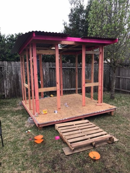 It’s HOT in Texas so we vented the walls by spacing the boards about and inch and a half apart to keep air moving (I stashed a fan in there as well). Also, the roof is a plastic type material and not tin as it may appear.