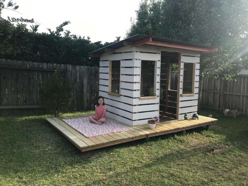 Four months and who knows how many hours of labor…our Magnolia inspired playhouse is finally done! The idea to attempt building a playhouse came when husband brought home a truckload of discarded wood pallets. While our intention was to repurpose these pallets, we found limited sturdy pieces that we incorporated where possible.